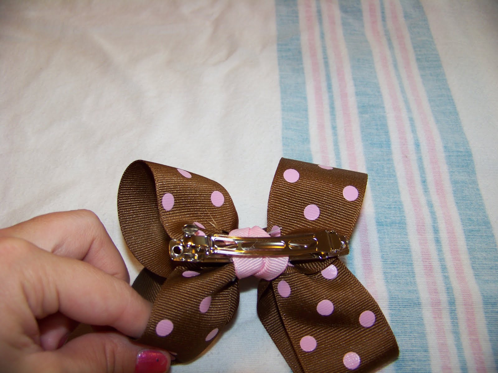 Next you are going to take your french clip apart and glue the bottom piece to the back of your hair bow. (Sorry I don't have pictures of this step.) Now take your smaller piece of ribbon and tie a knot in the center of it. Glue the knot to the front of the bow and wrap the ends around to the back. Now glue the ends of the ribbon to the clip. Put your clip back together and there ya have it.